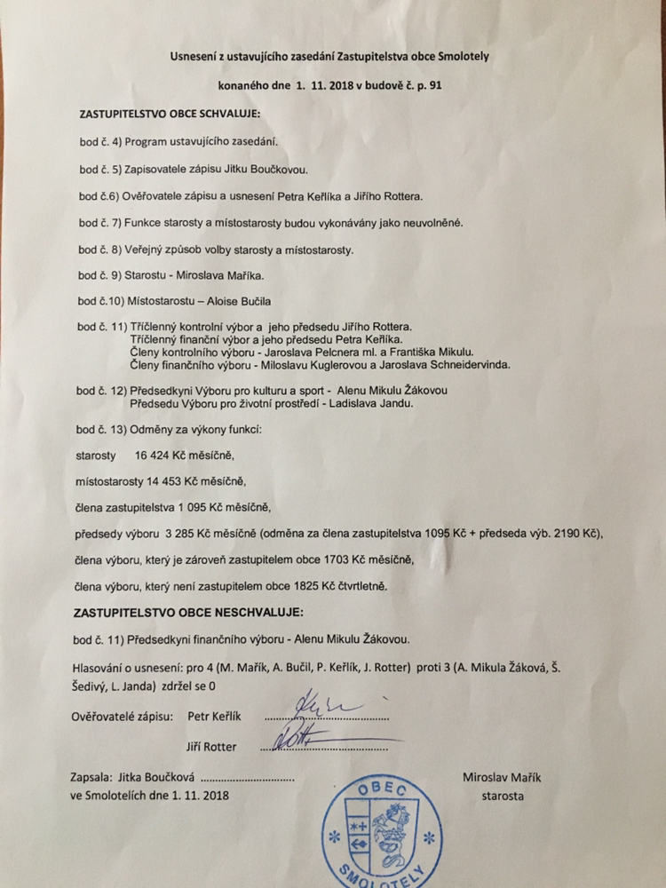 Usnesení z ustavujícího zasedání Zastupitelstva obce Smolotely